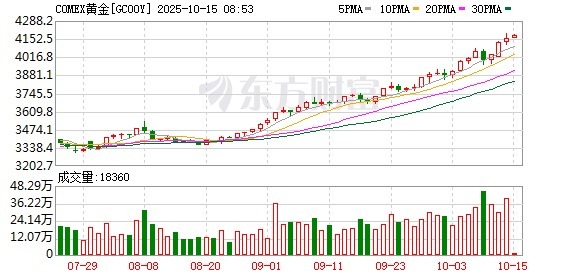 期货方面,COMEX黄金期货也迎来大涨。截至记者发稿,COMEX黄金期货日内大涨0.45%,报4151.7美元/盎司,盘中一度触及4190.9美元/盎司,距离4200美元/盎司大关仅一步之遥,亦创下历史新高。